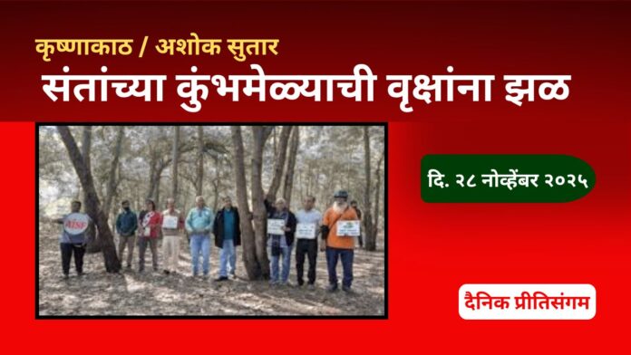 कुंभमेळा असला तरी, विकास आणि पर्यावरण यातील समतोल साधून काय करायचे ते करा, असे राज्य सरकारला ठणकावून सांगण्याची वेळ आली आहे. कुंभमेळा प्राधिकरणाने निर्णय प्रक्रिया अधिक पारदर्शक आणि अभ्यासपूर्वक केली पाहिजे, हेच जनमत सांगत आहे. तपोवनात १२०० एकर जागेवर साधूग्राम उभारले जाणार आहे. त्यातील ५४ एकर जागा महापालिकेच्या ताब्यात असून ही जागा मोकळी करण्यासाठी येथील झाडांचे सर्वेक्षण करुन १८०० झाडांवर महापालिकेने फुली मारली आहे. ही झाडे तोडण्यात येणार असल्याच्या रागातून पर्यावरणप्रेमींनी वृक्ष आलिंगन आंदोलन सुरु केले आहे. ‘हे रामा, ही १८०० झाडे तुच वाचव, प्रशासनाला सुबुद्धी दे’, असा संताप पर्यावरणप्रेमींनी व्यक्त केला आहे. संभाव्य वृक्षतोडीवरुन कुंभमेळा मंत्री गिरीश महाजन यांच्यावर अप्रत्यक्ष टीका होत आहे. पर्यावरणप्रेमींसह नागरिकांकडून वृक्षतोडीला विरोध होत आहे. कुंभमेळा मंत्री महाजन यांनी म्हटले आहे की, निसर्गाचे संगोपन झाले पाहीजे ही आंदोलकांची भूमिका अतिशय योग्य आहे. पण, कुंभमेळा हा १२ वर्षातून एकदा येतो. त्याकडे केवळ देशाचे नाही तर अवघ्या जगाचे लक्ष आहे. गेल्या अनेक वर्षांपासून तपोवनातील साधूग्रामची परंपरा आहे. साधूग्राम साठीच ही जागा राखील ठेवण्यात आली आहे. त्यामुळे झाडे काढावीच लागतील, त्याशिवाय साधू-महंताची व्यवस्था होऊ शकणार नाही. कुंभमेळा मंत्री गिरीश महाजनांचे हे अल्पज्ञान आहे असे वाटते. कारण पूर्वीचे साधुसंत निसर्ग बेचिराख करून अध्यात्म प्राप्त करत नव्हते. संतांनी निसर्ग वाचविण्याचे आवाहन केलेले आढळते. संत तुकाराम म्हणतात, वृक्षवल्ली आम्हां सोयरीं वनचरें । पक्षी ही सुस्वरें आळविती ॥१॥ येणें सुखें रुचे एकांताचा वास । नाहीं गुणदोष अंगा येत ॥२॥ संत ज्ञानेश्वरांनी तर निसर्गातील विविध घटकांना ईश्वराचे रूप संबोधले आहे. त्यांच्या अभंगातून निसर्गाचे महत्व आणि आदर व्यक्त केला आहे.